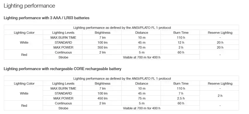 - Three white lighting levels: MAX BURN TIME, STANDARD (better power/burn time balance) and MAX POWER