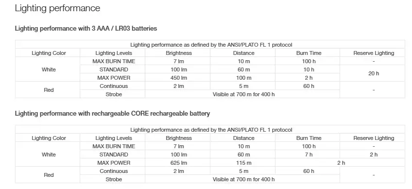 - Three white lighting levels: MAX BURN TIME, STANDARD (better power/burn time balance), and MAX POWER
